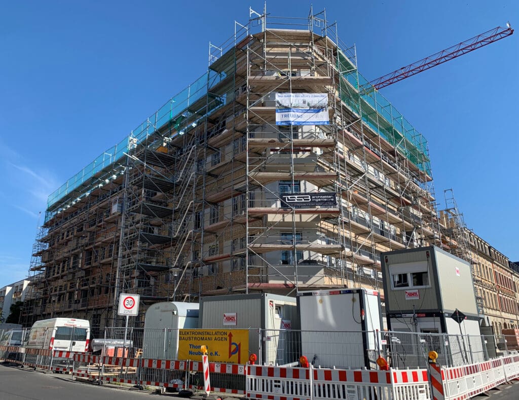 Der Fortschritt der Baustelle Bergmannstrasse in Dresden lässt das Gebäude langsam Gestalt annehmen. Mehr zu dem Projekt hier.