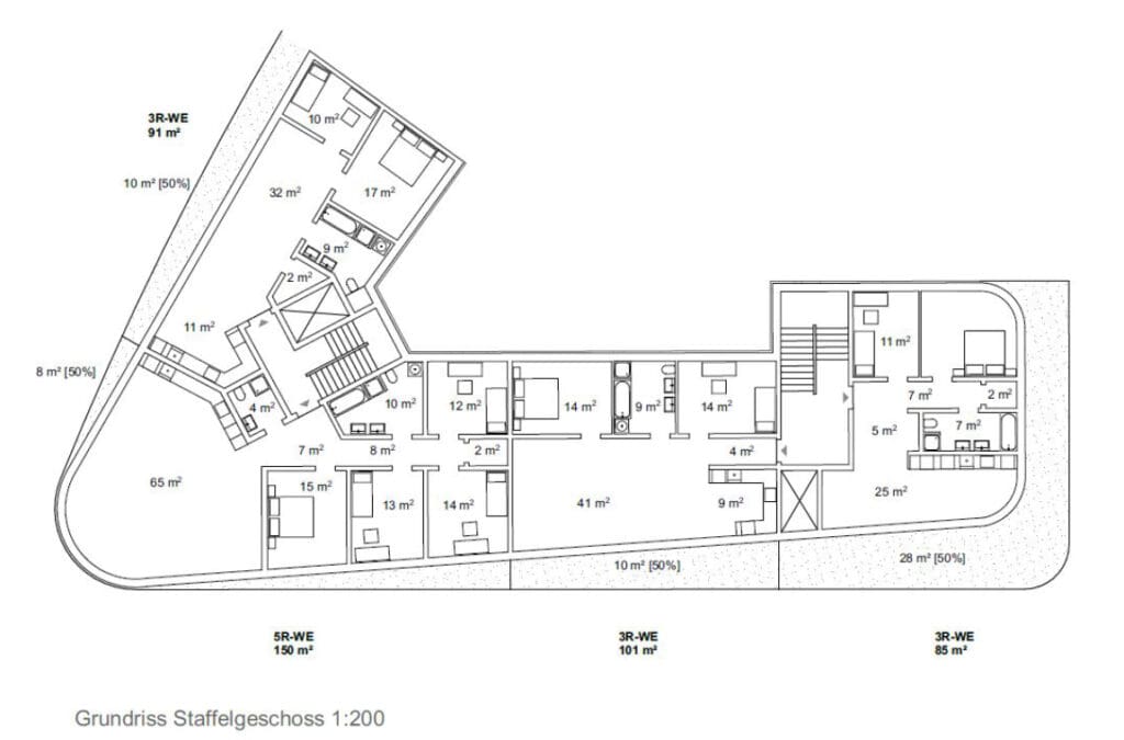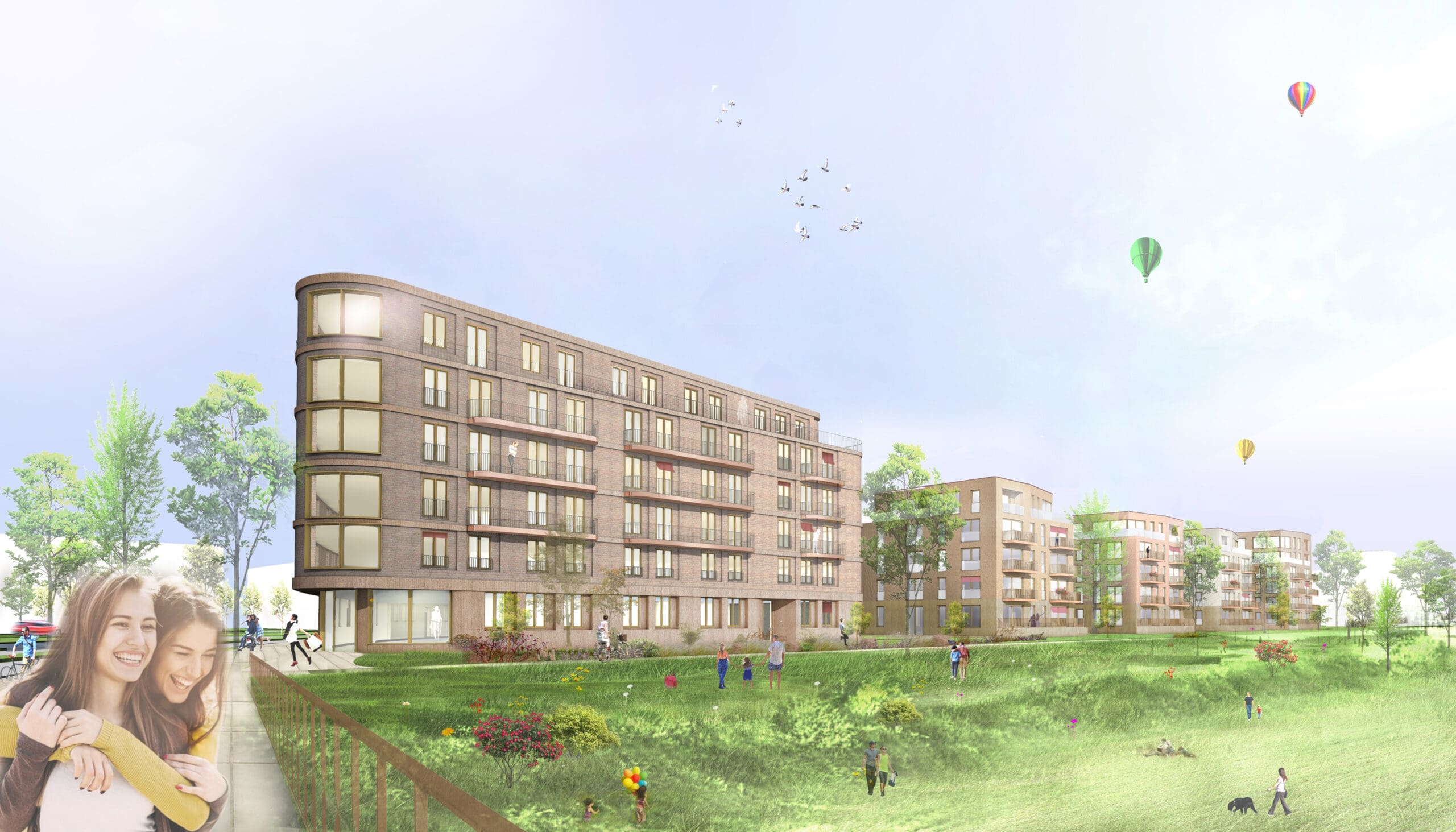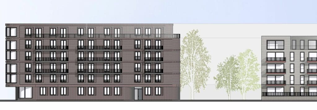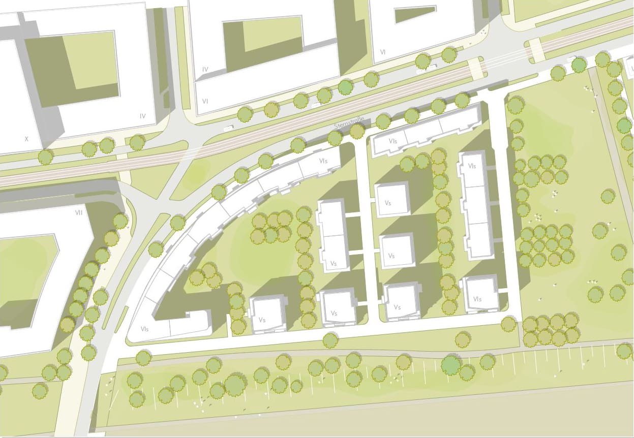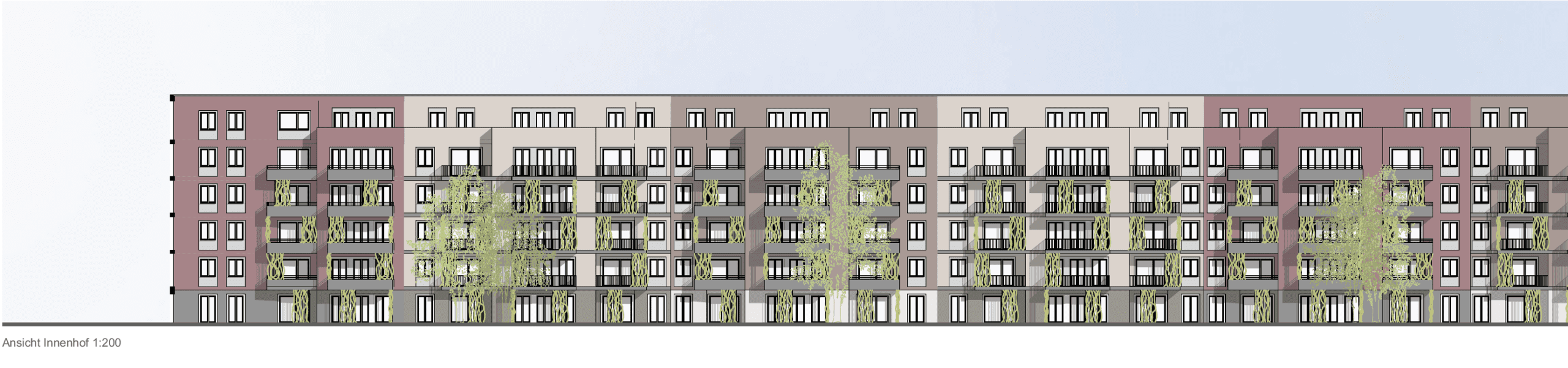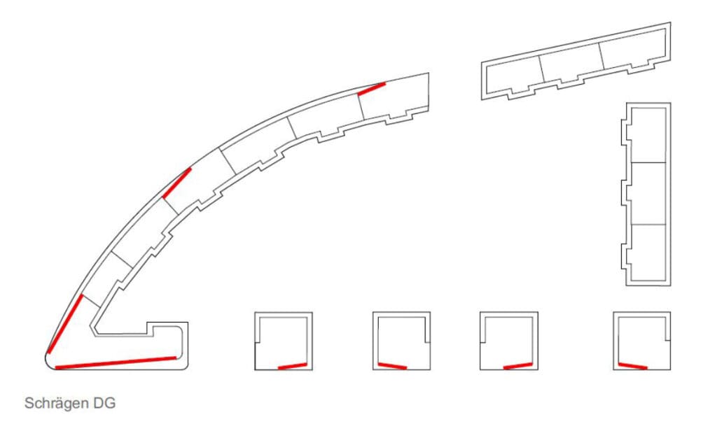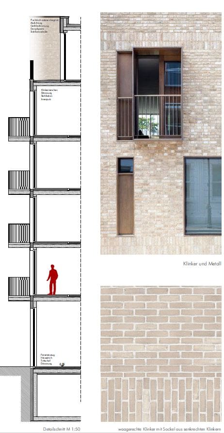 Die Bebauung des Areals am Elbbogen in Dresden nimmt Gestalt an: TSSB gewinnt den kombinierten Städtebau, Architektur und Fassadenwettbewerb für ein großes neues Wohngebiet an der Flutrinne. Der städtebauliche Entwurf gliedert sich, durch das Ausbilden der Eckbebauung zum Brückenkopf, klar in einen großzügigen, urbanen Straßenraum und eine offene Bebauungsstruktur in Richtung Flutrinne und Grünzug. Der gebogene Straßenverlauf wird durch das Ausrunden der Gebäudeecke weitergeführt und leitet dadurch den Wechsel zur Uferkante ein. Eine städtebauliche Betonung erfährt das Eckgebäude durch das bis an die Hauptfassade vorgezogene Staffelgeschoss mit der Wirkung, dass das Dachgeschoss an der Ecke zu 6 Geschossen heranwächst. Die leicht zurück versetzte Gewerbezone im Erdgeschoss ermöglicht ein Auskragen, der sich darüber befindlichen Geschosse und gibt zudem den Blick auf das Naturdenkmal der Flutrinne frei. Das schräge Herausziehen der Staffelgeschosse an der runden Ecke wird zum Leitmotiv der Gebäude. So erfährt die lange Fassade eine Gliederung und die freistehenden Solitäre entwickeln eine lokale Identität. Durch das Leitmotiv des Klinkers, ist die Fassade auch trotz stark wechselnder Witterungsverhältnisse in Elbnähe langlebig und wird in ihrer Optik zudem nicht beeinträchtigt. Umlaufende Gesimsbänder aus stehenden Klinkerformaten gliedern das Gebäude in seiner Horizontalität und stärken sogleich das Sockelgeschoss mit seinen Gewerbeeinheiten. Filigrane Balkongeländer aus Rundstäben lockern die Gesamterscheinung auf. Die Fassaden erhalten wiederkehrende Fensterteilungen mit stehenden Formaten, welche den Charakter des Quartiers maßgeblich prägen. Das Erdgeschoss als Sockelgeschoss wird betont und optisch abgesetzt. Um ein einheitliches Gesamtbild zu erhalten, wird in den Regelgeschossen darauf verzichtet die Zwischenpodeste der Treppenhäuser an der Fassade abzubilden. Durch das Zurücksetzen jener Podeste sind die Fenster noch öffenbar. Prägend für die straßenseitige Fassade ist das Auslaufen der Staffelgeschosse hin zu den Gebäudeecken des Baufelds, sowie zum mittleren Baukörper. Das Thema der angeschrägten Dachgeschosse wird in den Solitären zur Flutrinne aufgegriffen und verbindet durch die aufgelockerte Dachlandschaft Architektur mit Freiraum. Als Material werden hochwertige Klinkerriemchen verschiedenen Farbnuancen vorgesehen. Diese frostbeständige Fassadengestaltung wird auf die Massivwände mit Dämmung aufgeklebt und bietet einen praktischen Schutz der Außenhülle vor Feuchtigkeitseindringung und Nässe. Der angrenzende Grünraum der Flutrinne vernetzt sich tief in das Quartier bis hin zur Hoffassade. Rankgerüste an den Balkonen im Innenhof gewährleisten eine natürliche Verschattung im Sommer und verbessern das Mikroklima an heißen Tagen. Zudem wird den Anwohnern die Möglichkeit gegeben „urban gardening“ direkt auf dem eigenen Balkon zu betreiben. Zipscreens und Fallarmmarkisen als Sonnenschutz ergänzen die qualitativ hochwertige Gesamterscheinung. Die Farbgebung der Innenhöfe orientiert sich an den Klinkern der Straßenfassade und bietet eine Vielfalt. Die Dächer werden als Flachdächer aus Stahlbeton mit extensiver Begrünung vorgesehen und erhalten eine umlaufende Attika. Durch Verwendung von dauerhaften und natürlichen Materialien, wie Klinker, bleiben die Fassaden lange ansehnlich, ohne neue Veredelung der Oberflächen. Hofseitig, ermöglichen die Rankgerüste eine grüne Aufwertung mit individuellen Nutzungsmöglichkeiten durch die Bewohner. Die individuelle Gestaltung der Fassaden ermöglicht den Anwohnern, trotz großer Fassadenlängen, Identität mit dem Ort zu entwickeln und diesen wertzuschätzen. Die Verwendung der Materialien, ihren natürlichen Eigenschaften entsprechend, in Verbindung mit einer modernen Bauweise ist ökologisch nachhaltig und schafft dadurch einen ökonomischen Mehrwert.