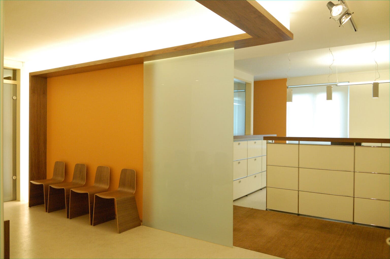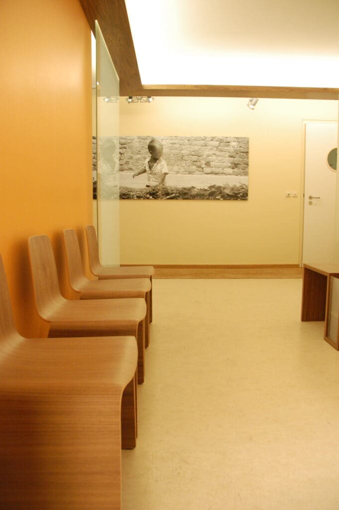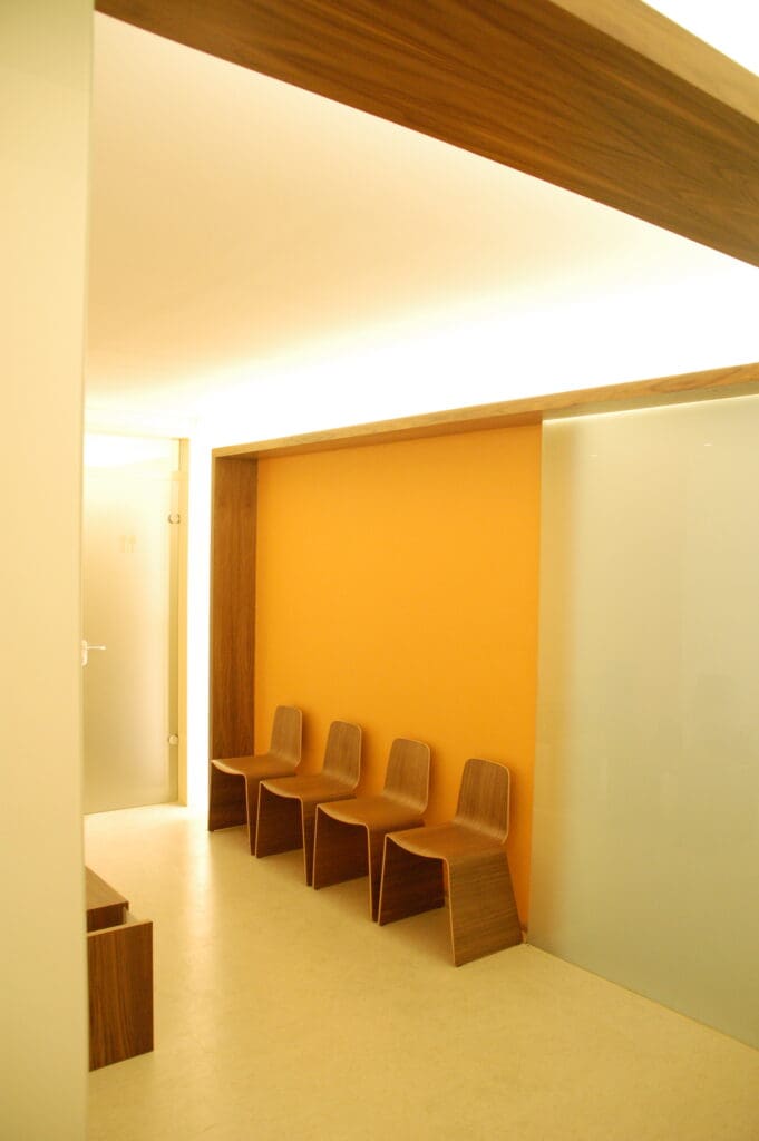 Die bestehende Praxis wurde nach den neuesten technischen Anforderungen und effektiveren Arbeitsabläufen neu konzipiert und bei laufendem Betrieb umgebaut.Der Patientenbereich bildet das Zentrum der neuen Aufteilung. Die Behandlungsbereiche sind separiert, so dass Patienten ungestört zu den Behandlungsräumen wechseln können. Trennung von reinen und unreinen Räumen, sowie bessere Licht- und Arbeitsbedingungen für die Mitarbeiter in Nähe der Anmeldung.Der Wartebereich wird räumlich offener gestaltet und mit einem Lichtmöbel als Raumteiler in den Arbeitsablauf integriert. Tageslicht im Anmeldebereich macht das Arbeitsumfeld und den ersten Eindruck der Praxis freundlicher und heller.Helle Naturmaterialien wie Linoleum, Kokos und Nussbaum bilden einen angenehmen Grundton. Die funktionalen Bereiche sind für Desinfektionsmittel ausgelegt. Farbige Akzente an den Wänden und große Fotos zeigen die persönliche Note der Praxis.
