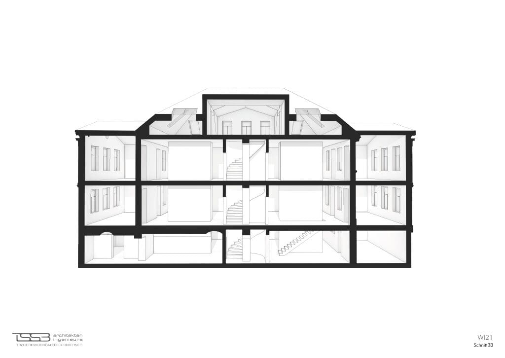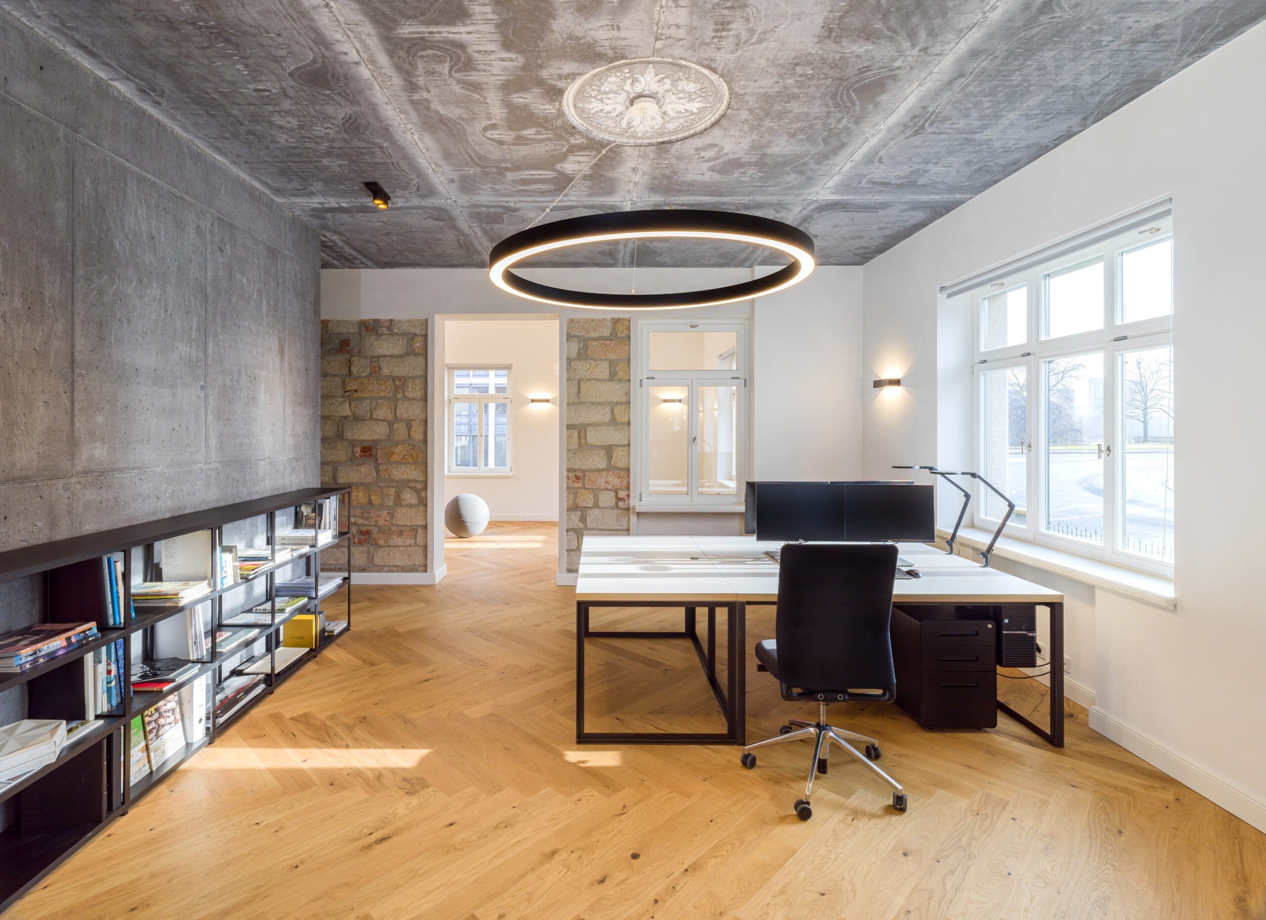 Die seit 30 Jahren als Ruine leerstehende, Dresdner Behr´sche Villa des einstigen, sächsischen Finanzministers August von Behr, stammt aus dem Jahr 1827 und wurde vor dem weiteren Verfall bewahrt und aufwändig saniert. Sie wurde in ein modernes Bürohaus verwandelt und beherbergt nun auch den TSSB Standort Dresden. Der Zustand war gezeichnet von Wasserschäden, Brandschäden, Hausschwamm durch alle Etagen und die vertiefte Lage zu dem Strassenniveau liess das Gebäude unscheinbar wirken. Deshalb wurde der untere Sockel auf EG-Niveau angeschüttet, der Dachstuhl erneuert und die Villa komplett entkernt. Durch die Spiegelung des vorhandenen, rechten Seitenanbaus auf die linke Seite, entsteht eine 3-teilige Gliederung des Gebäudes und bildet nun eine symmetrische Gesamterscheinung. Der bewusste Umgang mit dem Ursprung war das wichtigste Anliegen und zeigt sich besonders durch die Erhaltung der Bestandsmaterialien Sandstein, Ziegelstein, Putz und Schiefer. Ein Farbkonzept in schwarz/weiss unterstützen die historischen Details auf zurückhaltender, eleganter Weise, gliedert den Innenraum und greift die neue 3-teilige Symmetrie der Kubatur auf. Sowohl historische Details, wie der offengelegte Dachgesims im Innenraum oder die Rosetten als Negativrelief in der Sichtbetondecke die an die Vergangenheit erinnern, sowie auch moderne Materialien wie schwarz eingefärbte Leichtbetondecke und schwarze 3D Fliesen im Bad, bilden interessante Kontraste. Alle Schritte unterlagen strengen Auflagen des Denkmalamts, wobei die Gesamterscheinung und die Substanz erhalten bleiben mussten. Die, seit 1993 zu Kulturdenkmal ernannte Villa, erscheint nun in neuem Glanz und zeichnet ein städteprägendes Bild, das in der breiten Öffentlichkeit viel Zustimmung findet.