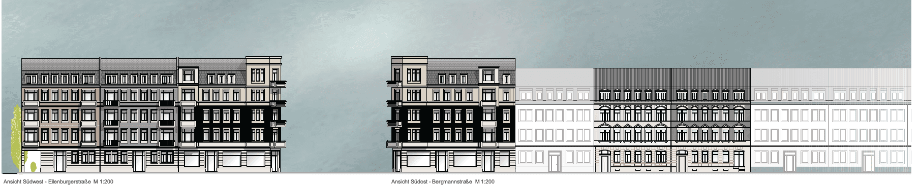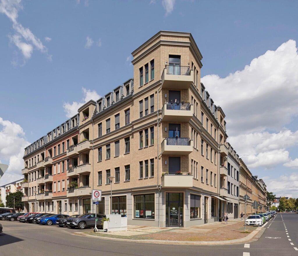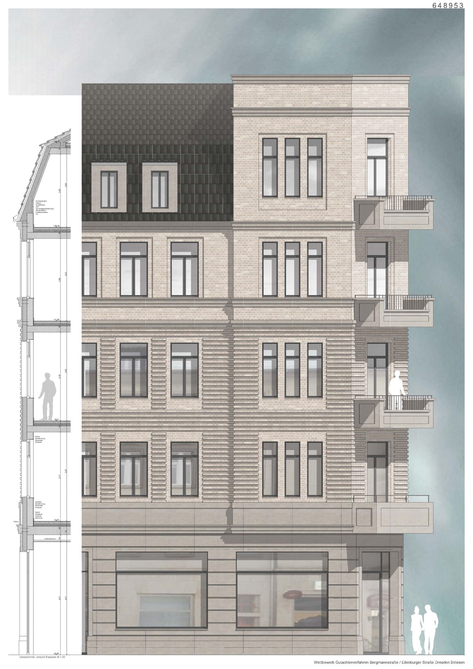 Als Entree zum Striesener Wohnviertel entsteht nahe dem ehemaligen Dorfkern das neue Wohn- und Geschäftshaus Ecke Bergmannstr./Eilenburger Straße. Als städtebauliche Leitidee wird die Blockrandstruktur mit Überhöhung der Ecksituation und die Wiederaufnahme der ehemaligen 4-Geschossigkeit aufgenommen.Die Neuinterpretation der klassischen Proportionen mit Sockelgeschoss, Standardgeschoss und Dach, orientiert sich an historischen Vorbildern. Auf diese Weise wird die Integration des Vorhabens in die städtebauliche Umgebung und deren Nachbarn gewährleistet. Die Gesimse und der Materialwechsel sind aus den Strukturen der Nachbarschaft übernommen. Als Fassadenmaterialien kommen nur historische Materialien wie Klinker und Sandstein zum Einsatz.Die Gebäude werden als Wohngebäude errichtet mit insgesamt 34 Mieteinheiten und 3012 qm Mietfläche, davon sind drei Gewerbeeinheiten im EG des Eckgebäudes direkt von außen zugänglich. Die Wohnungen erhalten einen modernen Zuschnitt und generieren Belichtung immer von zwei Seiten, sowie ruhige Schlafräume auf der straßenabgewandten Seite.