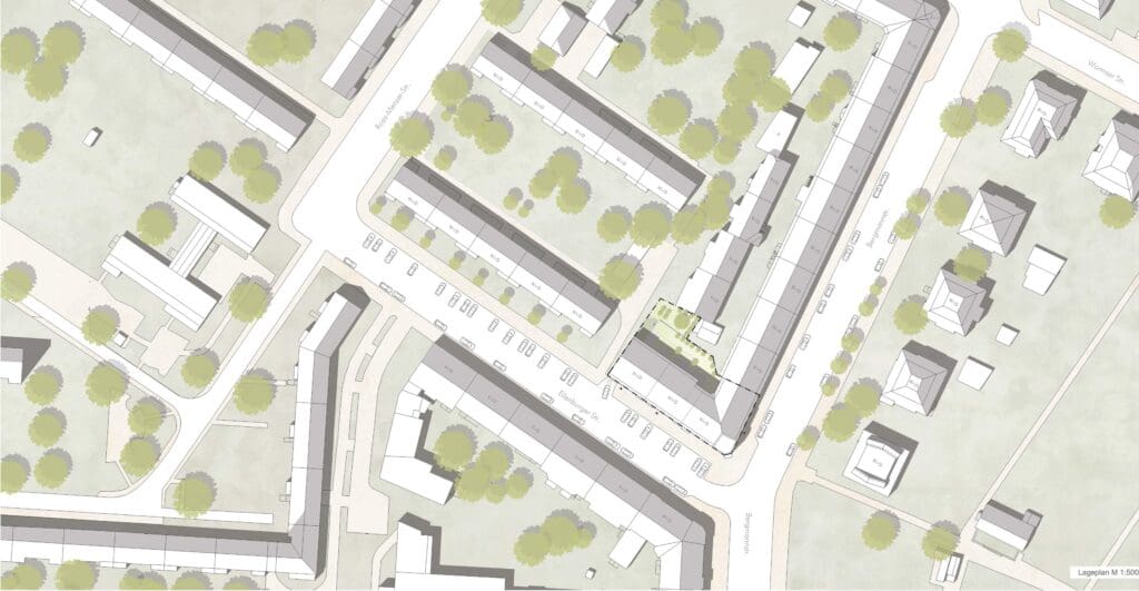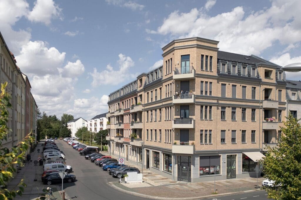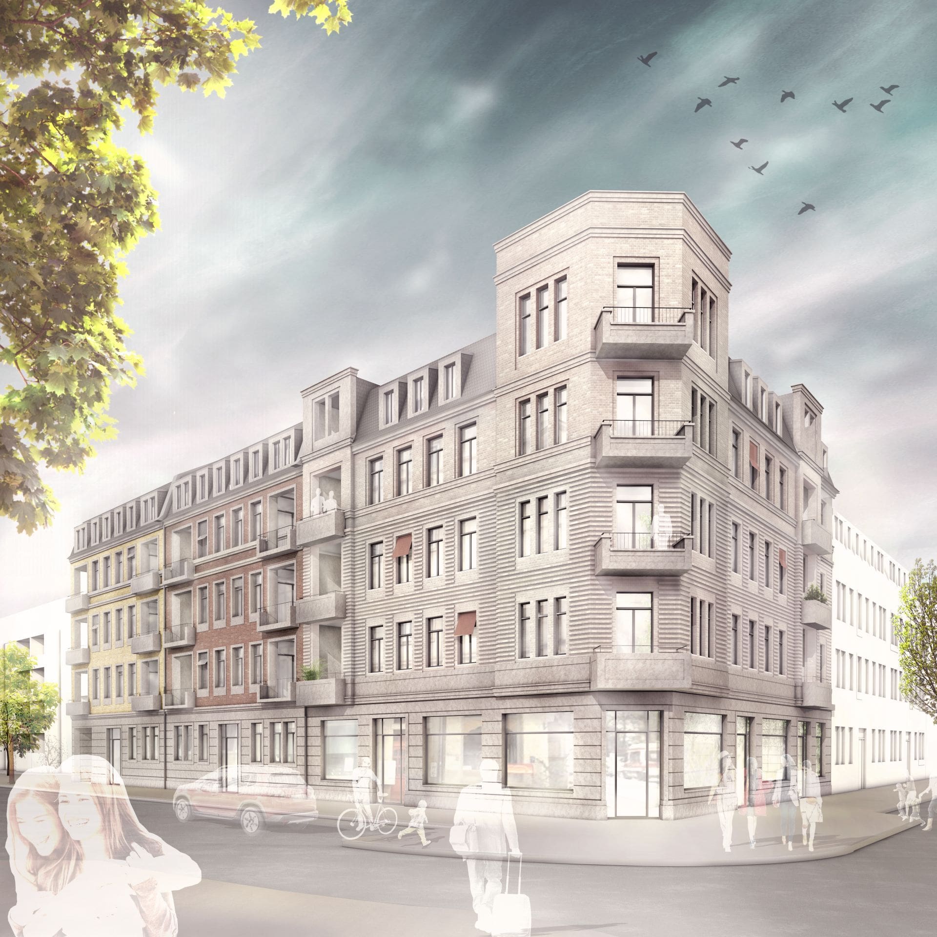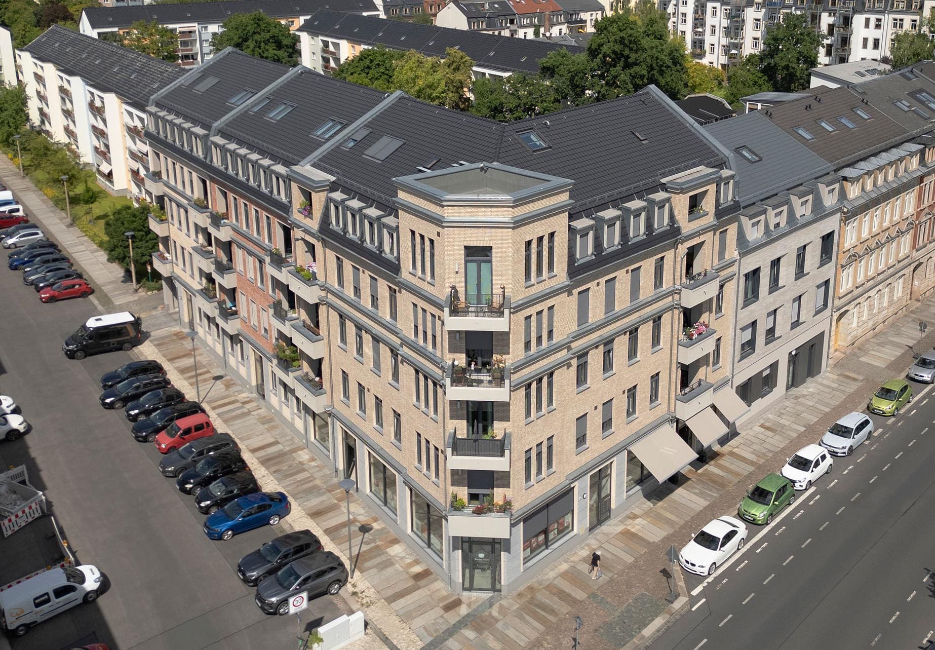 Als Entree zum Striesener Wohnviertel entsteht nahe dem ehemaligen Dorfkern das neue Wohn- und Geschäftshaus Ecke Bergmannstr./Eilenburger Straße. Als städtebauliche Leitidee wird die Blockrandstruktur mit Überhöhung der Ecksituation und die Wiederaufnahme der ehemaligen 4-Geschossigkeit aufgenommen.Die Neuinterpretation der klassischen Proportionen mit Sockelgeschoss, Standardgeschoss und Dach, orientiert sich an historischen Vorbildern. Auf diese Weise wird die Integration des Vorhabens in die städtebauliche Umgebung und deren Nachbarn gewährleistet. Die Gesimse und der Materialwechsel sind aus den Strukturen der Nachbarschaft übernommen. Als Fassadenmaterialien kommen nur historische Materialien wie Klinker und Sandstein zum Einsatz.Die Gebäude werden als Wohngebäude errichtet mit insgesamt 34 Mieteinheiten und 3012 qm Mietfläche, davon sind drei Gewerbeeinheiten im EG des Eckgebäudes direkt von außen zugänglich. Die Wohnungen erhalten einen modernen Zuschnitt und generieren Belichtung immer von zwei Seiten, sowie ruhige Schlafräume auf der straßenabgewandten Seite.