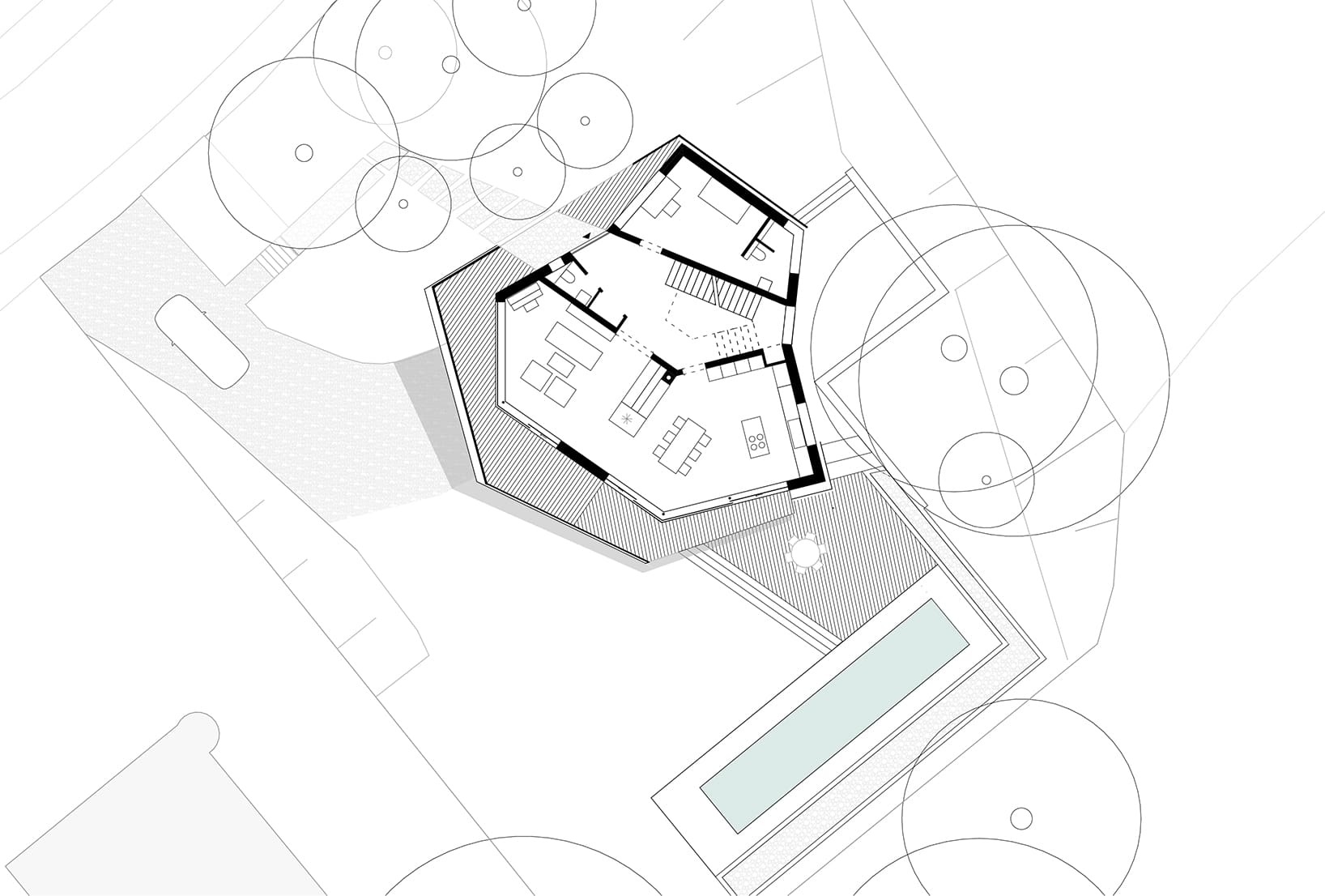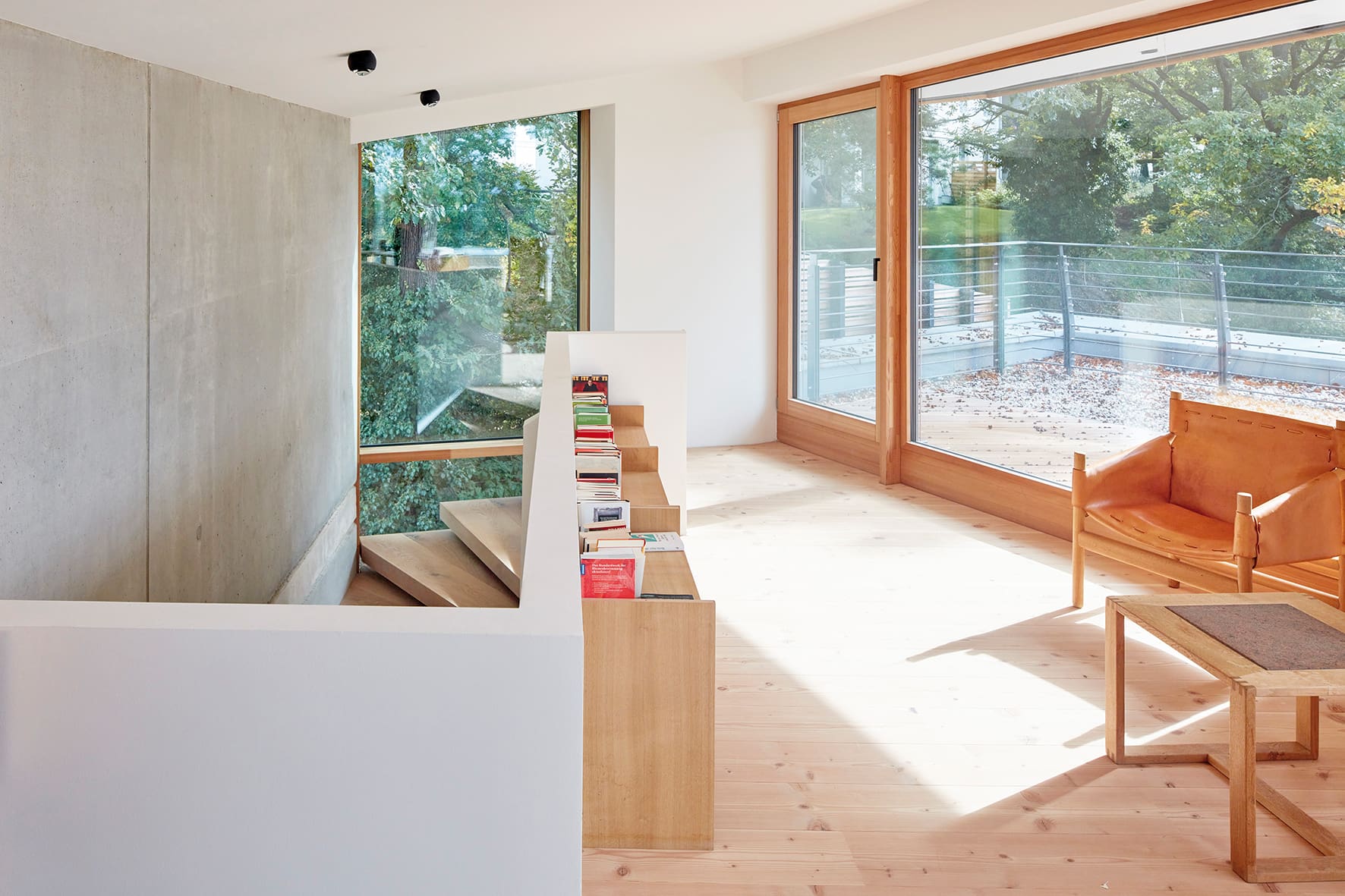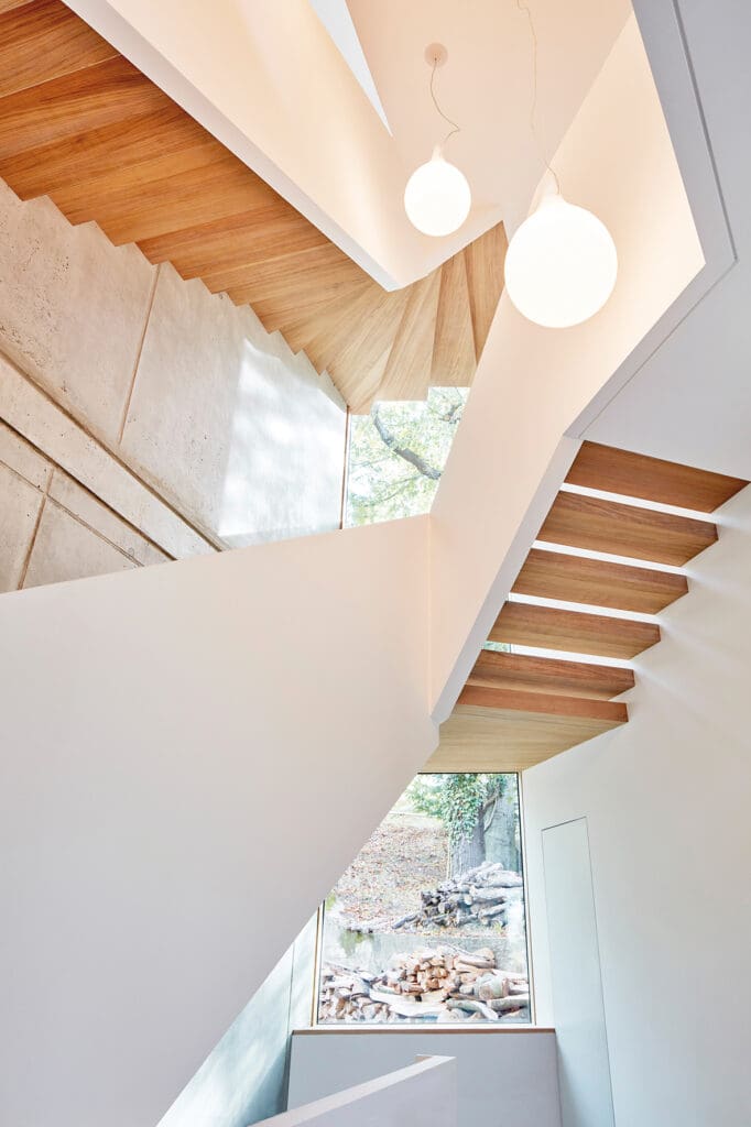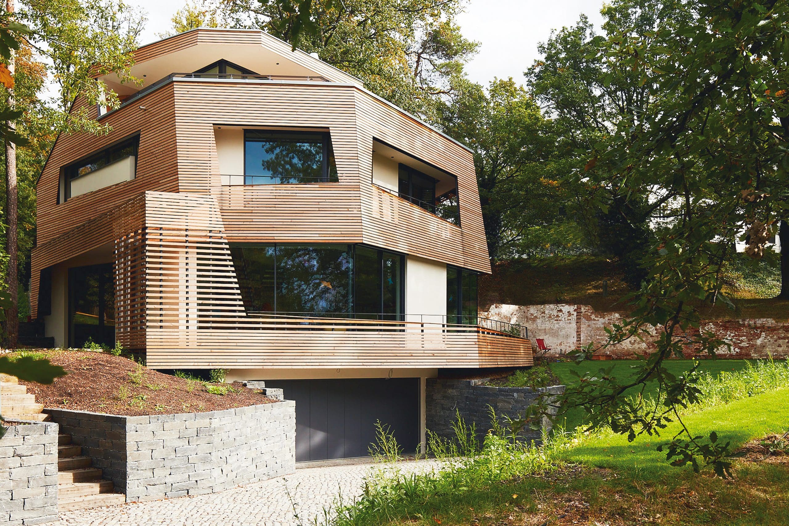 Das Wohnhaus befindet sich im historisch gewachsenen Villenviertel Oberloschwitz mit Blick über Dresden und die Elbe. Es entstand ein skulpturaler Neubau, der durch die behutsame Einbettung in das Gelände und den geschützten Gehölzbestand, und durch die Anforderungen der Bauherren an die Innenräume seine Form fand.Der massiv gebaute Baukörper bekommt eine luftige Holzfassade aus verdeckt befestigten Rhombusleisten in sibirischer Lärche. Im Obergeschoss bildet ein umlaufender Balkon, geschützt von der abgerückten Holzhülle‘, einen Übergangsbereich zwischen Innen und Außen.Im Erdgeschoß schaffen hohe Räume und große rahmenlose Schiebefenster eine offene luftige Atmosphäre. Der Fußboden in unbehandelter Eiche wird durch die Terrassendielung im Außenbereich fortgeführt und erweitert somit den Wohnbereich in die Natur.Das Herzstück des Gebäudes ist die Treppe, die sich der Form des Gebäudes folgend, entlang einer Sichtbetonwand, nach oben schraubt und einen großzügig offenen Flurbereich über alle Etagen schafft.