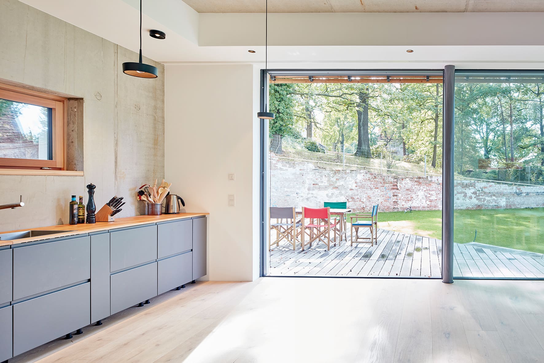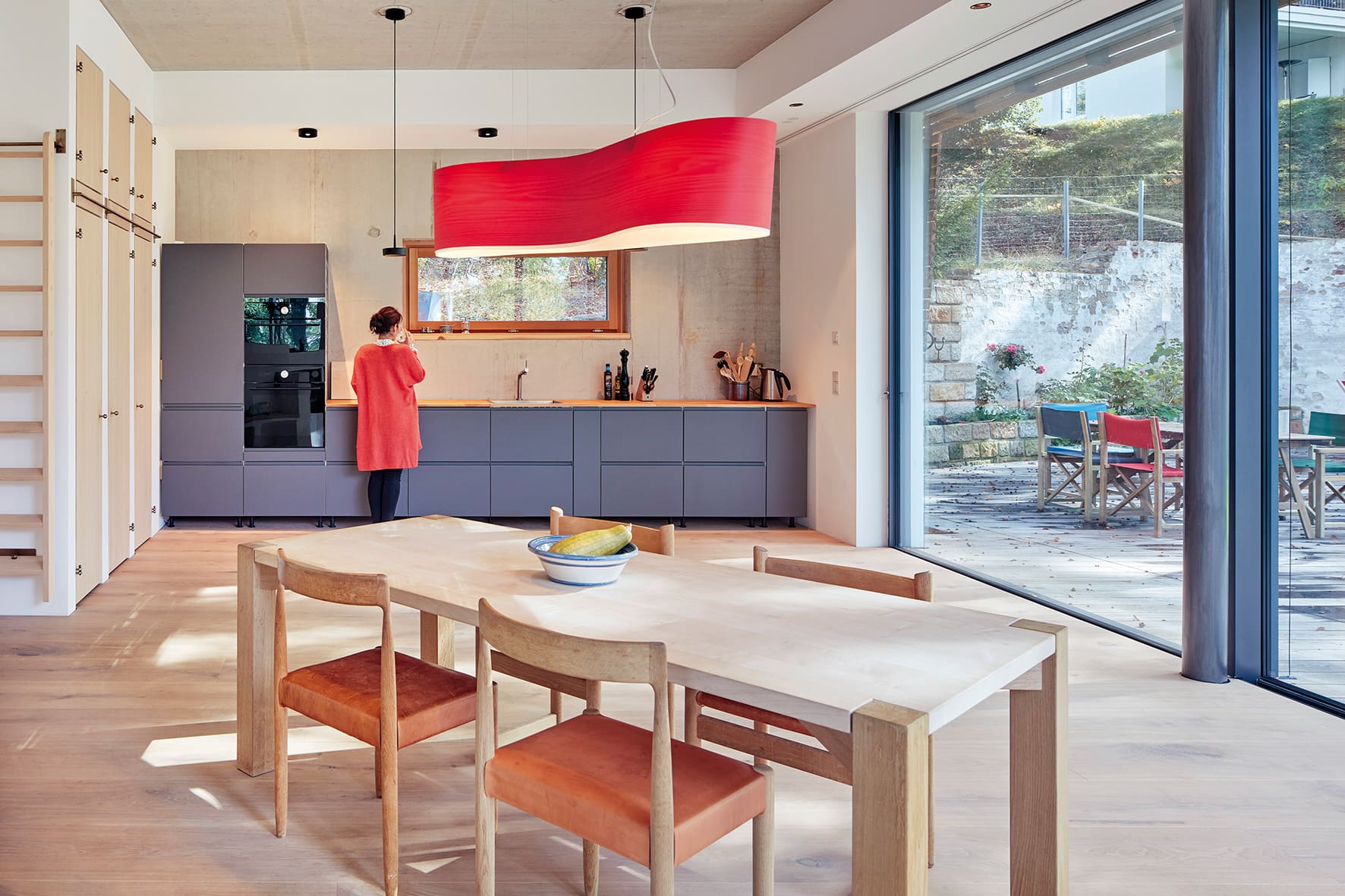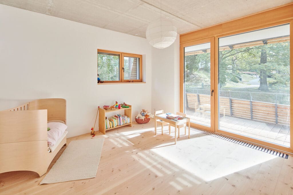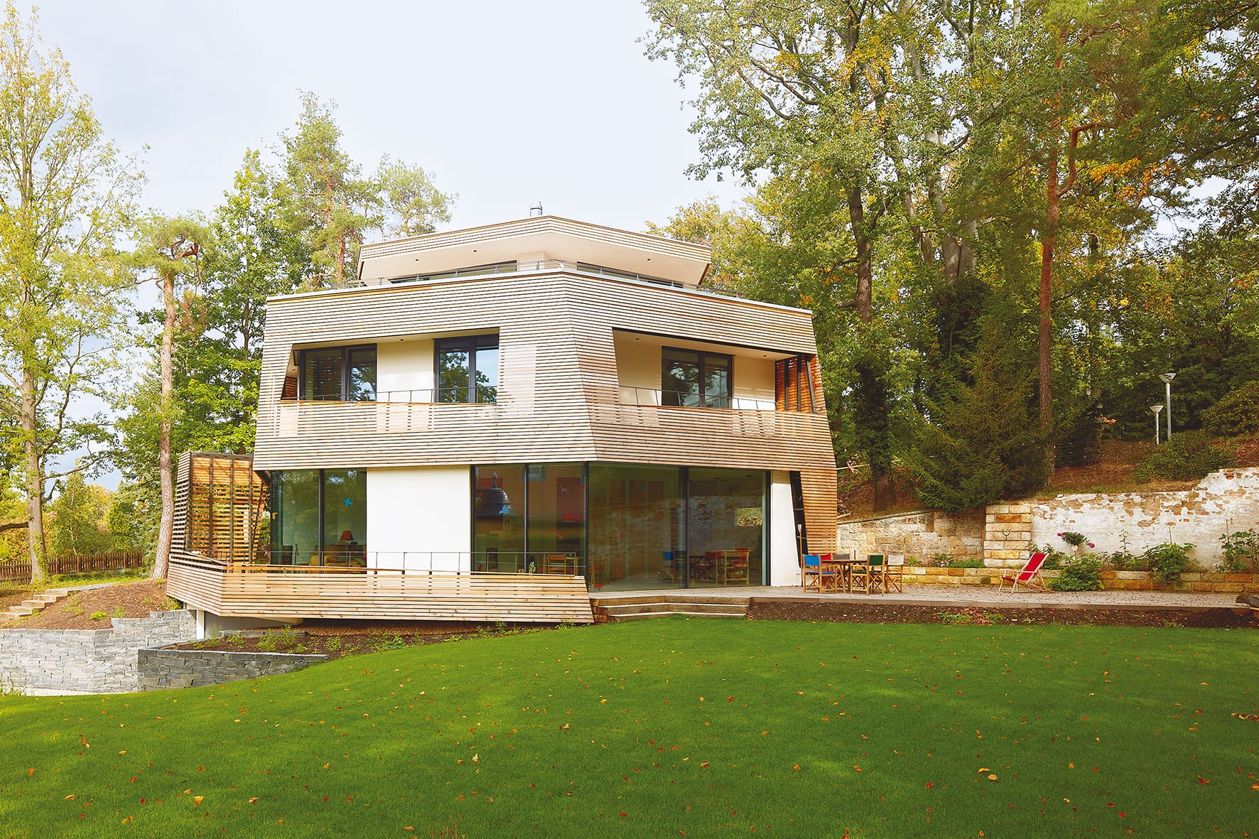 Der massiv gebaute Baukörper wirkt, durch die luftige Holzfassade aus verdeckt befestigten Rhombusleisten in sibirischer Lärche, wie ein Teil der Natur.