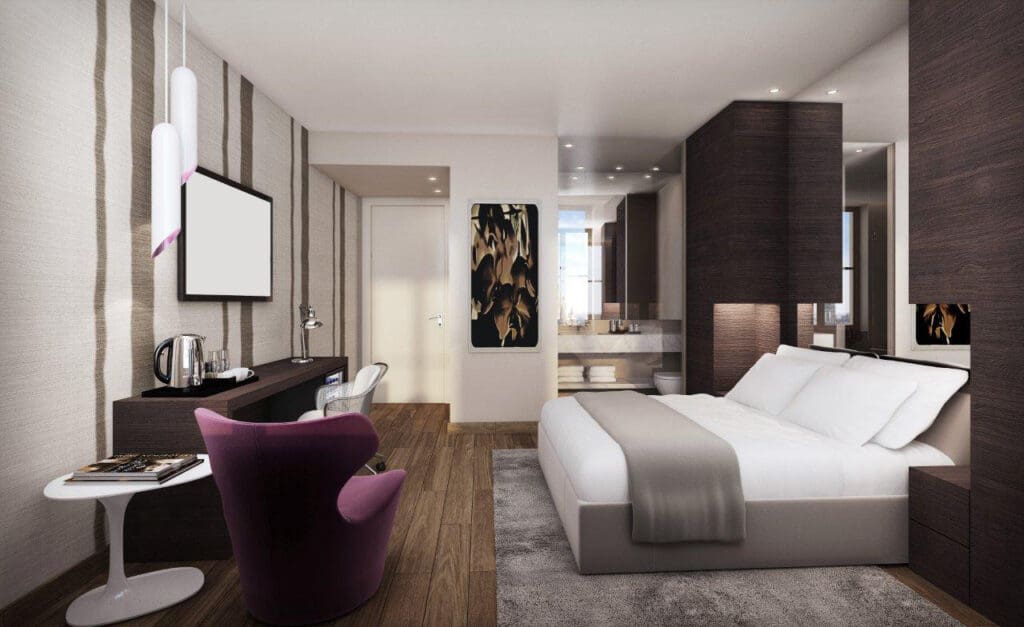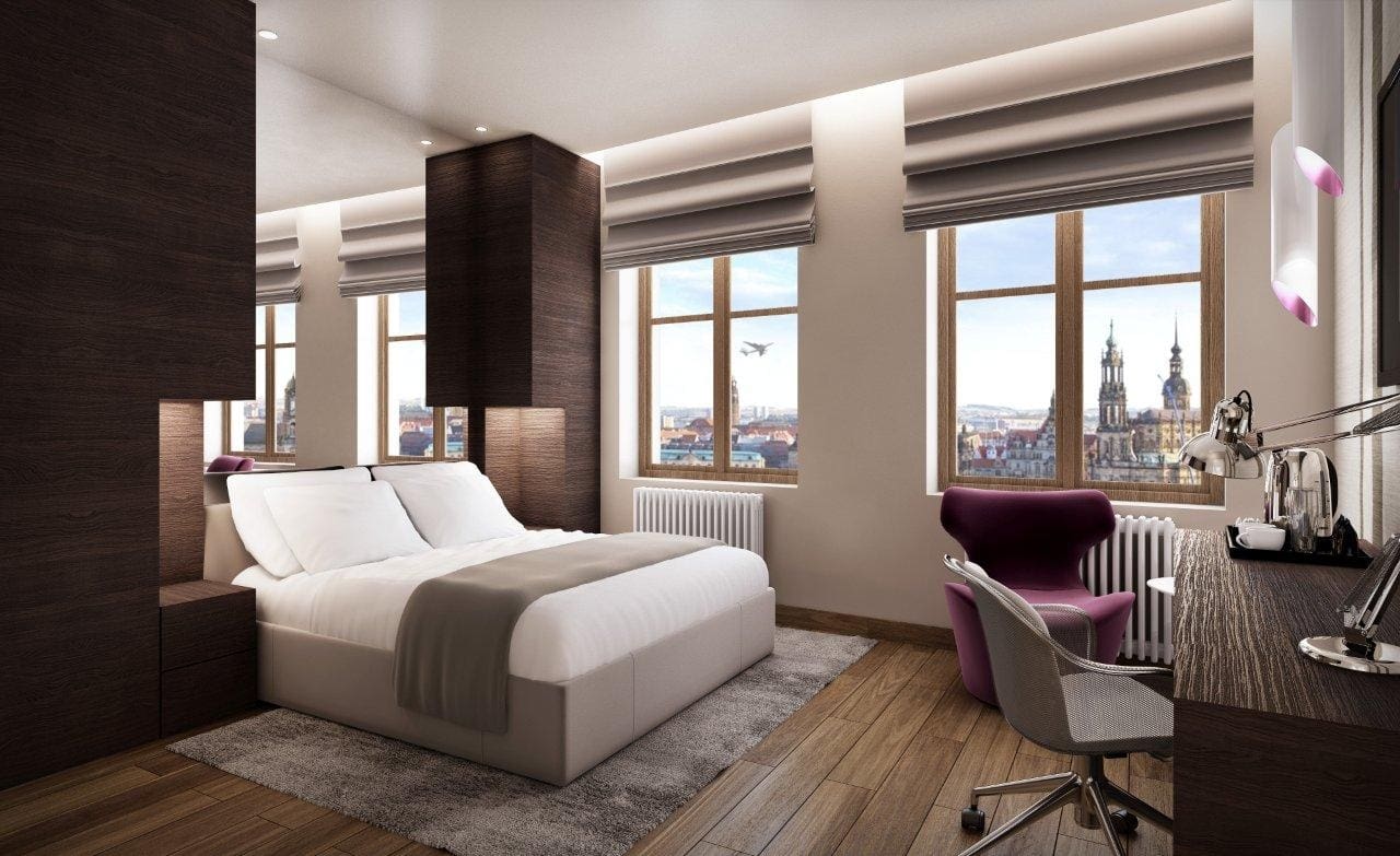 Das bestehende Bürogebäude auf der Ostra-Allee in Dresden wird zu einem Hotel mit 144 Zimmern umgebaut. Der Umbau erfolgt in allen Geschossen. Hierbei wird das Erdgeschoss mit Lobby, Rezeption, Restaurant und Bar über eine Rampe im Eingangsbereich barrierefrei erschlossen. Des Weiteren ist ein Anbau geplant, der den Bar und Restaurantbereich vergrößert. Im östlichen Gebäudeteil befinde die Hotelverwaltung und die Küche.Auf Grund von brandschutztechnischen Anforderungen wird neben den drei Bestandstreppen ein zusätzliches Treppenhaus am nördlichen Gebäudeteil gebaut. Über eine der vier Treppen gelangt man in die Obergeschosse. Hier befinden sich die Hotelzimmer. Neben den Standardzimmern gibt es auch barrierefreie Zimmergrundrisse. Die Bestandsfassade wird erhalten, lediglich der Neubau des Treppenhauses und der Anbau auf der Hofseite verändern die Nord- und Westfassade.