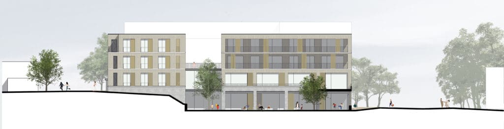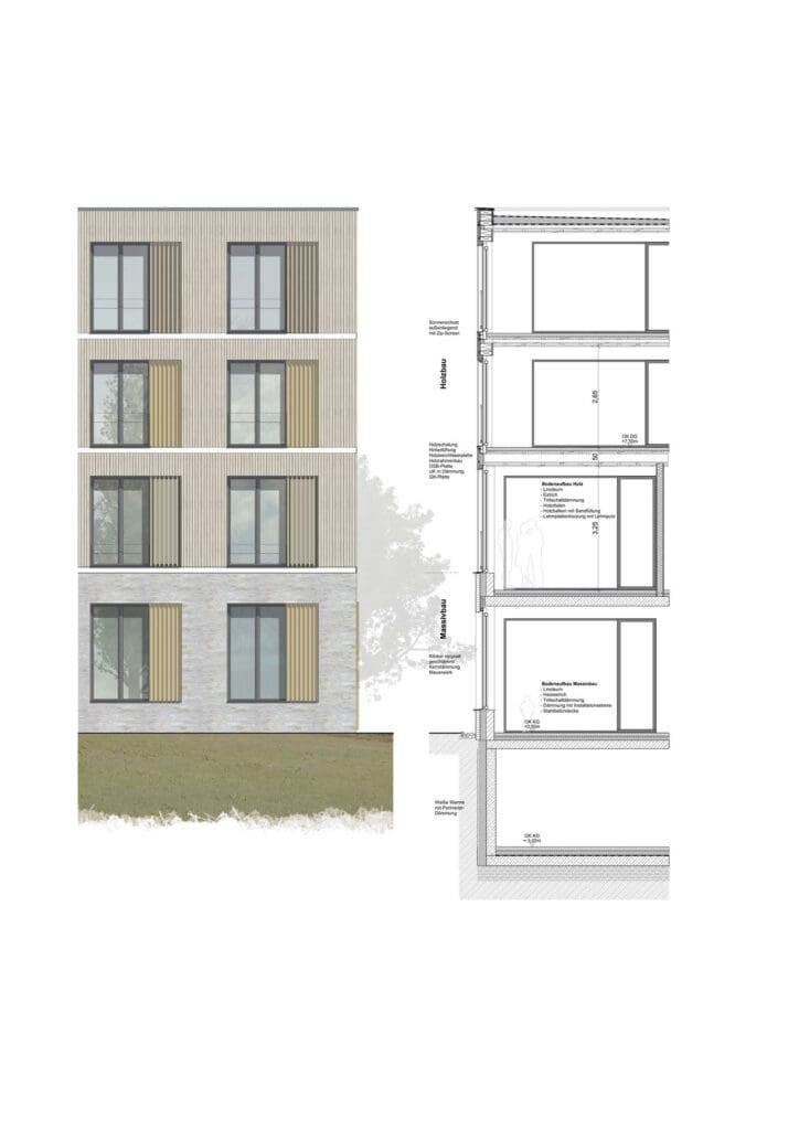 Mit der Kita und dem neuen Wohnen am Quartiersplatz soll für das neue Wohnviertel „Ziegelhöhe“ eine Mitte geschaffen werden. Von der südlichen Zufahrtsstraße aus kommend erlebt man den Quartierplatz gleichzeitig als architektonisch einprägsames ‘Tor’ zum Quartier, wie auch als lebendiges Zentrum. Alt und Jung treffen hier bei ihren alltäglichen Routinen zusammen und füllen das Viertel mit Leben. Das Wettbewerbsgebäude mit seiner Mischnutzung von Wohnen und Kinderbetreuung soll architektonisch ansprechend, dem menschlichen Maßstab gerecht werden, aber auch die westliche Platzkante definieren. Zusammen mit der östlichen Flankierung des Seniorenwohnheimes definieren diese beiden Kanten den Quartiersplatz. Durch den zukünftigen dritten Baustein, den Sonderbaustein im hinteren Bereich des Platzes, wird der Platz den notwendigen Rückhalt bekommen.