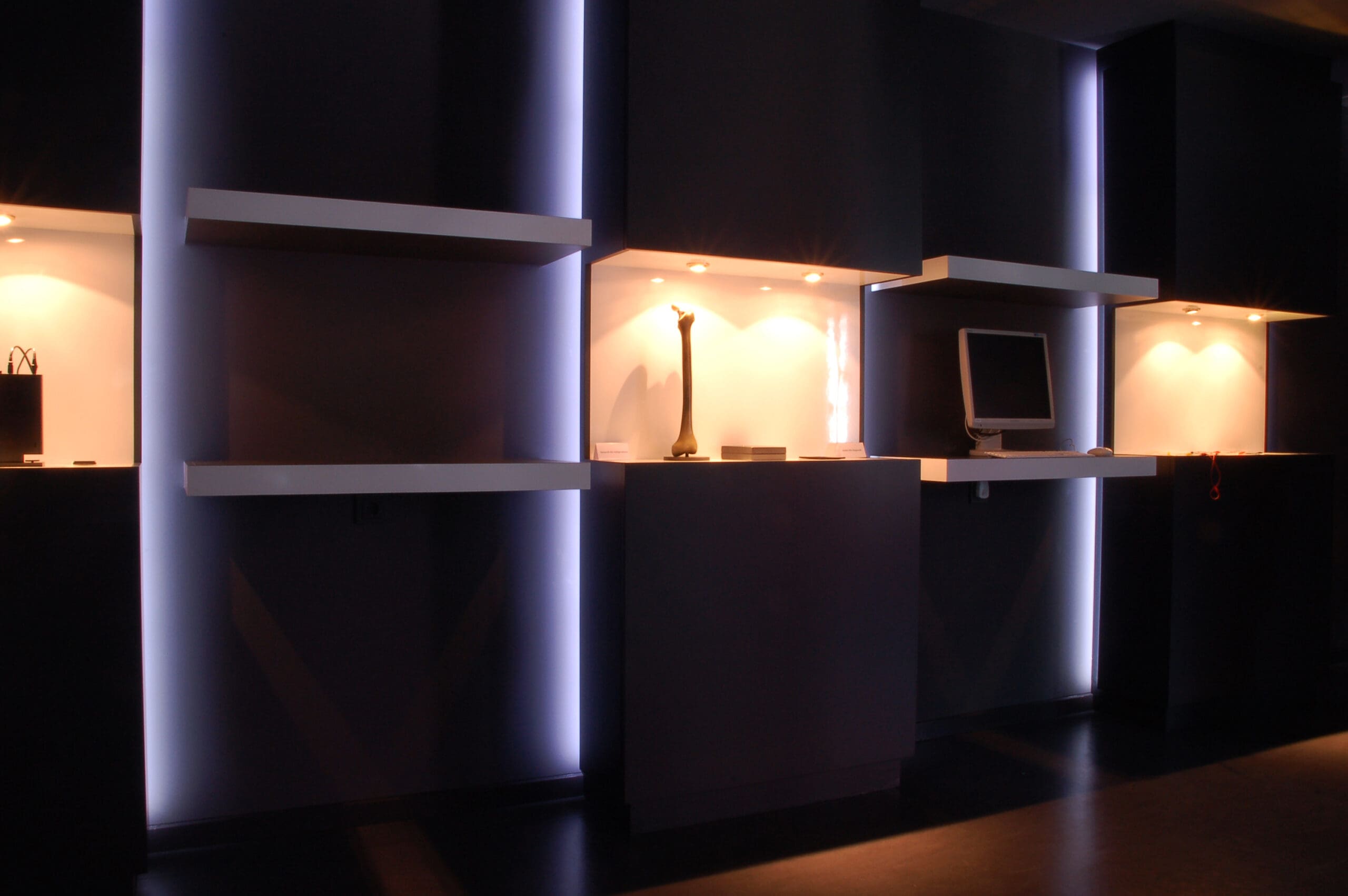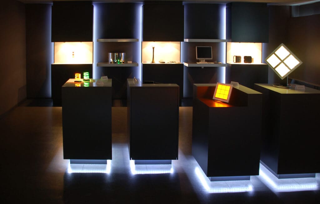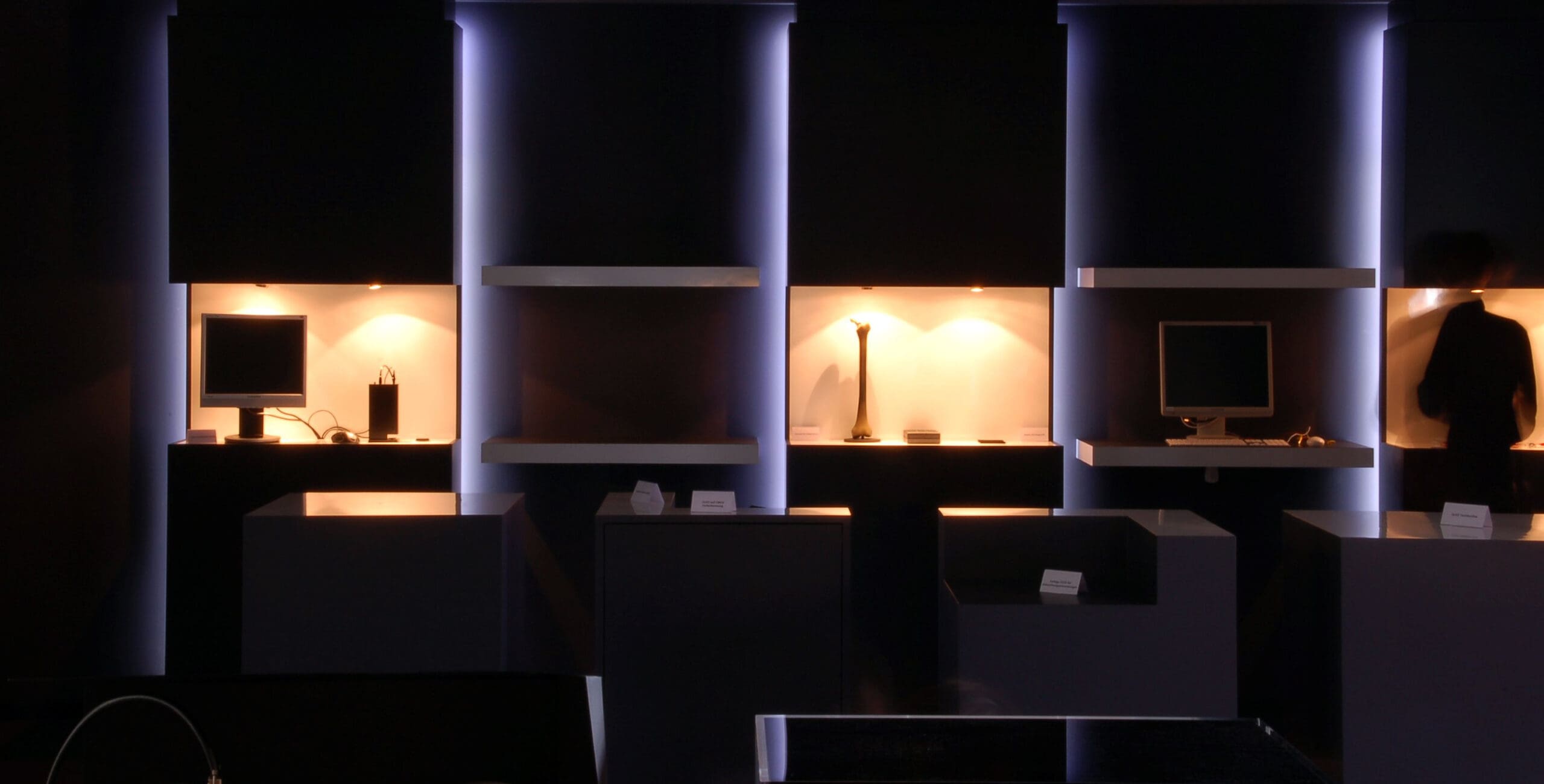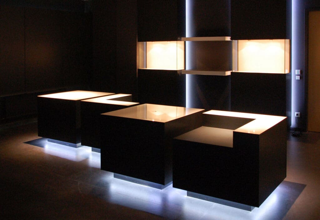 Ein eigenständiges Präsentationszentrum für die neuen Technologien des IPMS entstand im Fraunhofer Institut in Dresden-Klotzsche.Für das Institut für Photonische Mikrosysteme ist Licht das zentrale Thema. Im abgedunkelten Universum der Ausstellung schweben schwarze Kuben auf Lichtsockeln. Zwischen den Wandvitrinen erweitern die Lichtfugen den imaginären Raum.Durch die Komposition mit flachen Kuben im Raum und hohen Schrankvitrinen an den umgebenden Wänden erhält der Raum seine Großzügigkeit.Die anthrazitfarbenen Möbel sind matt lackiert, wohingegen die Aufstellflächen der Objekte mit hochglänzendem Weiß beschichtet einen edlen Hintergrund für die Objekte bieten.