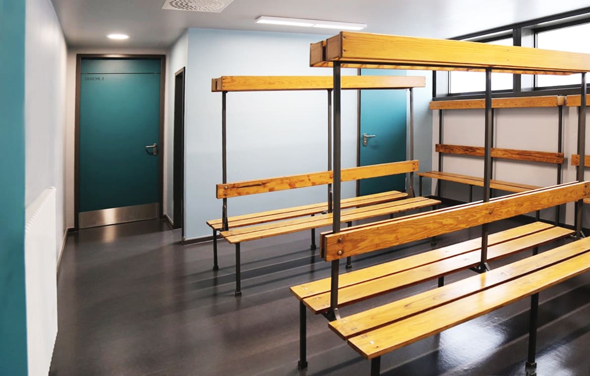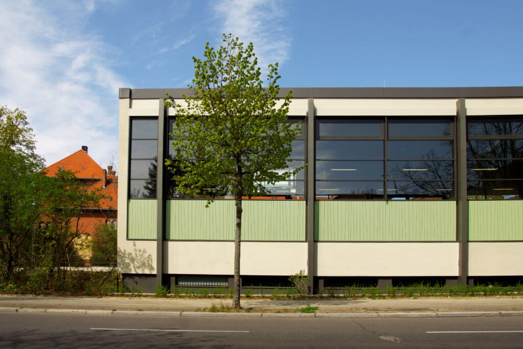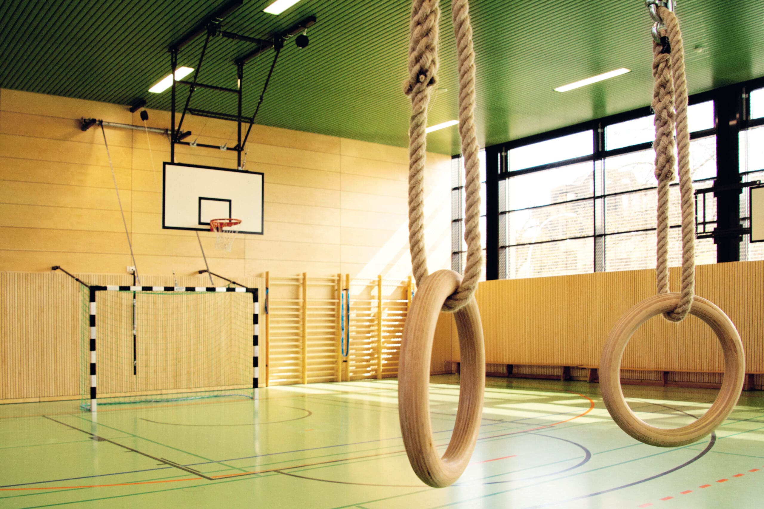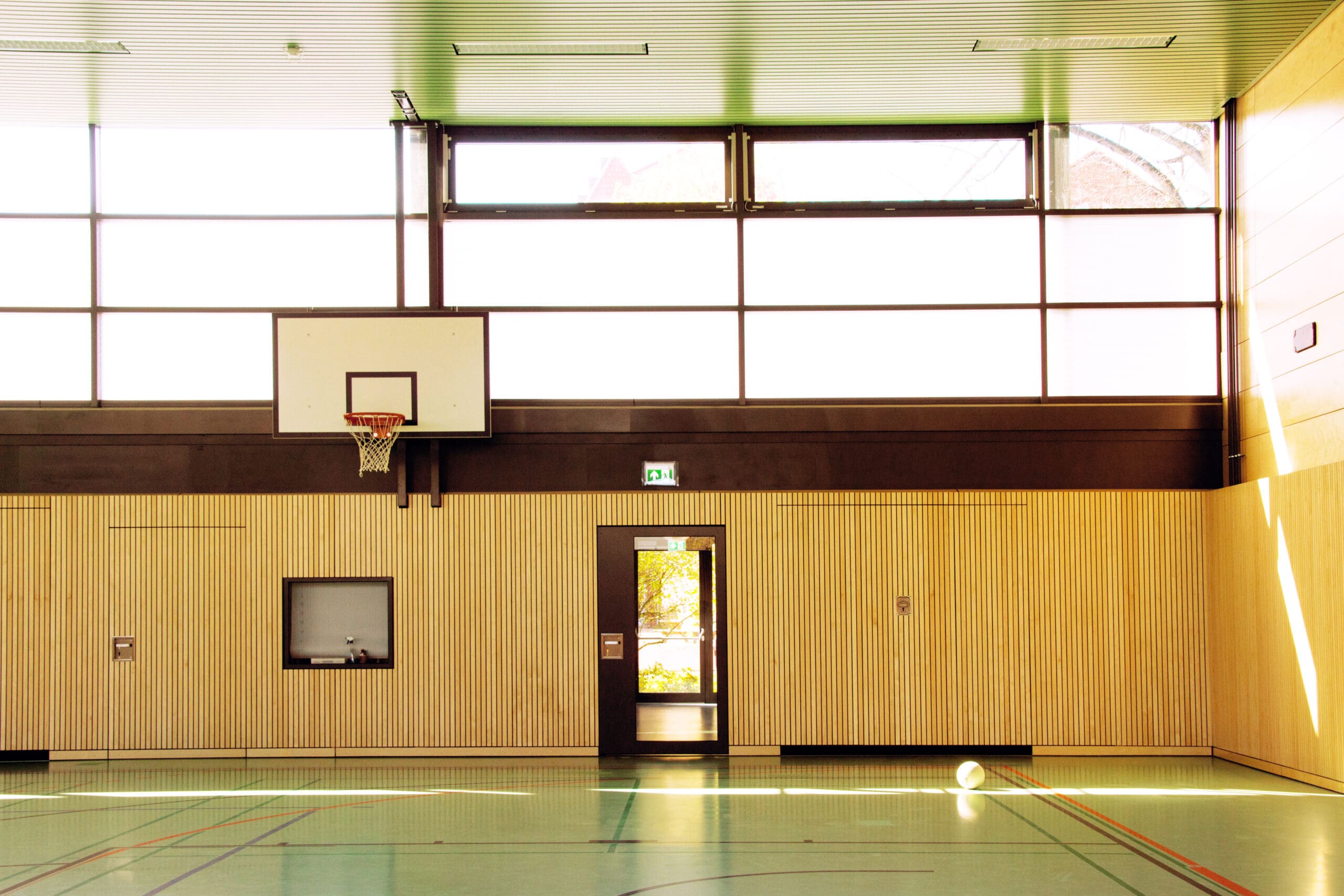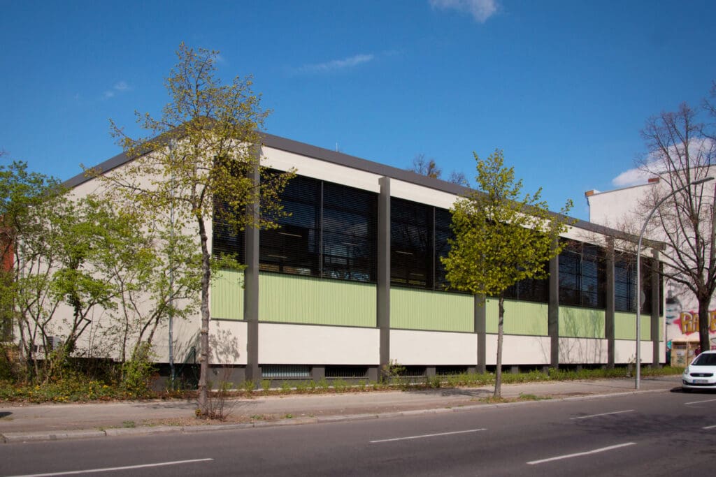 Die Sporthalle des Lilienthal-Gymnasium wurde, aufgrund zahlreicher altersbedingter Schäden, in drei Bauabschnitten saniert und pünktlich zu Beginn des Schuljahres 2019 wiedereröffnet. Im Jahr 2016 begann der 1. Bauabschnitt in dem der Sozialtrakt saniert wurde. Bis zu seiner Fertigstellung ein Jahr später, wurde die Raumaufteilung geändert, um die Halle auch barrierefrei nutzen zu können, Sanitärobjekte wurden ersetzt und die technischen Anlagen erneuert.Anschließend wurden im Jahr 2017/18 die undichten Fassaden des Sozialtraktes, sowie das Dach und die daran angrenzende Fassade des Hallenraumes saniert und der Wärmeschutz den aktuellen Anforderungen angepasst. Für die bestehende Fassade wurde eine vorgehängte hinterlüftete Fassadenkonstruktion gewählt, die mit hellgrünen Trespaplatten verkleidet wurde. Durch das einfräsen vertikaler Linien, mit unterschiedlichen Schrägstellungen, in die Oberfläche der Fassadenplatten, ergibt sich ein scheinbar fugenloses Gesamtbild. Da für die neue Hallenfassade aus statischen Gründen keine schwere Konstruktion gewählt werden durfte, wurde die neue Pfosten-Riegel-Konstruktion aus Aluminium zu einem großen Teil mit leichten Fiberglasplatten ausgefüllt. Lediglich im oberen Bereich konnte klares Glas eingesetzt werden. Des weiteren mussten die tragenden Stahlstützen der Hallenkonstruktion saniert werden, um die entstandenen Korrosionsschäden in dessen Hohlräumen zu beseitigen. In einem aufwendigen Verfahren mittels 360°- Düsen wurden die Hohlräume entrostet und eine Hohlraumversiegelung eingebracht, so dass weitere Korrosionsschäden in diesem Bereich verhindert werden konnten. Nach Abbruch des Hallenbodens wurden zahlreiche Schäden an der Betondecke deutlich, weshalb eine zusätzliche dünne Stahlbetonplatte auf die bestehende aufgebracht werden musste. Auch im Außenbereich wurden umfangreiche Schäden im Stahlbeton saniert und auf dem Dach anfallendes Niederschlagswasser konnte nicht ordnungsgemäß abfließen, da kein ausreichendes Gefälle vorhanden war.Der 3. Bauabschnitt umfasste die Erneuerung der Straßenfassade, die Sanierung der beiden Giebelwände der Halle und die Erneuerung aller Oberflächen im kompletten Halleninnenraum. Die alte Straßenfassade war undicht und marode. Hier entstand eine neue Pfosten-Riegel-Konstruktion, mit ähnlicher Aufteilung wie die der gegenüberliegende Hallenfassade. Es wurden statische Anpassungen in der Halle und in der darunter liegenden Tiefgarage durchgeführt. So war es möglich an der Straßenseite die Fassadenelemente vollständig mit Klarglas auszufüllen. In Anlehnung an die Fassade des Sozialtraktes ist auch hier der untere Teil der Fassade mit hellgrünen linear gefrästen Trespaplatten verkleidet. Die Wände des Halleninnenraumes wurden vollständig mit Holz verkleidet: im oberen Bereich mit großflächigen, akustisch wirksamen Platten, im unteren Bereich mit einem umlaufenden Prallschutz aus vertikalen Lamellen. Die Dachkonstruktion wurde mit blassgrünen Lamellen bekleidet, hinter der die neue Deckenstrahlheizung verlegt wurde. Im gleichen Farbton erstrahlt der neue Spotboden mit einer fugenlosen PUR-Oberfläche.